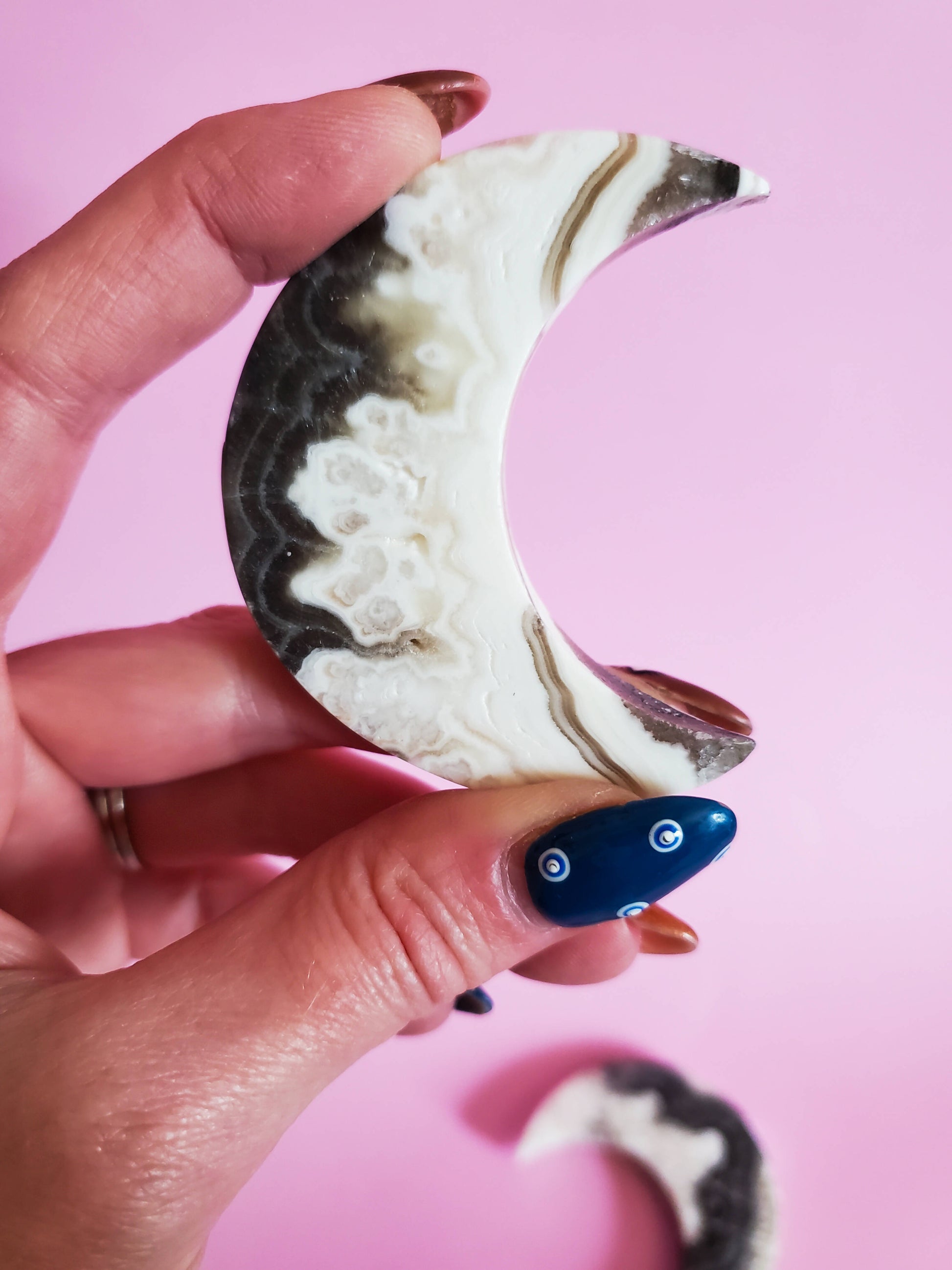 These are charming moon carvings made from Mexican calcite pieces. Moon carvings are meant to connect you to the mysteries of the night, and feminine energies. Each piece contains beautiful, naturally occurring swirls, colour variations and druzy caves.