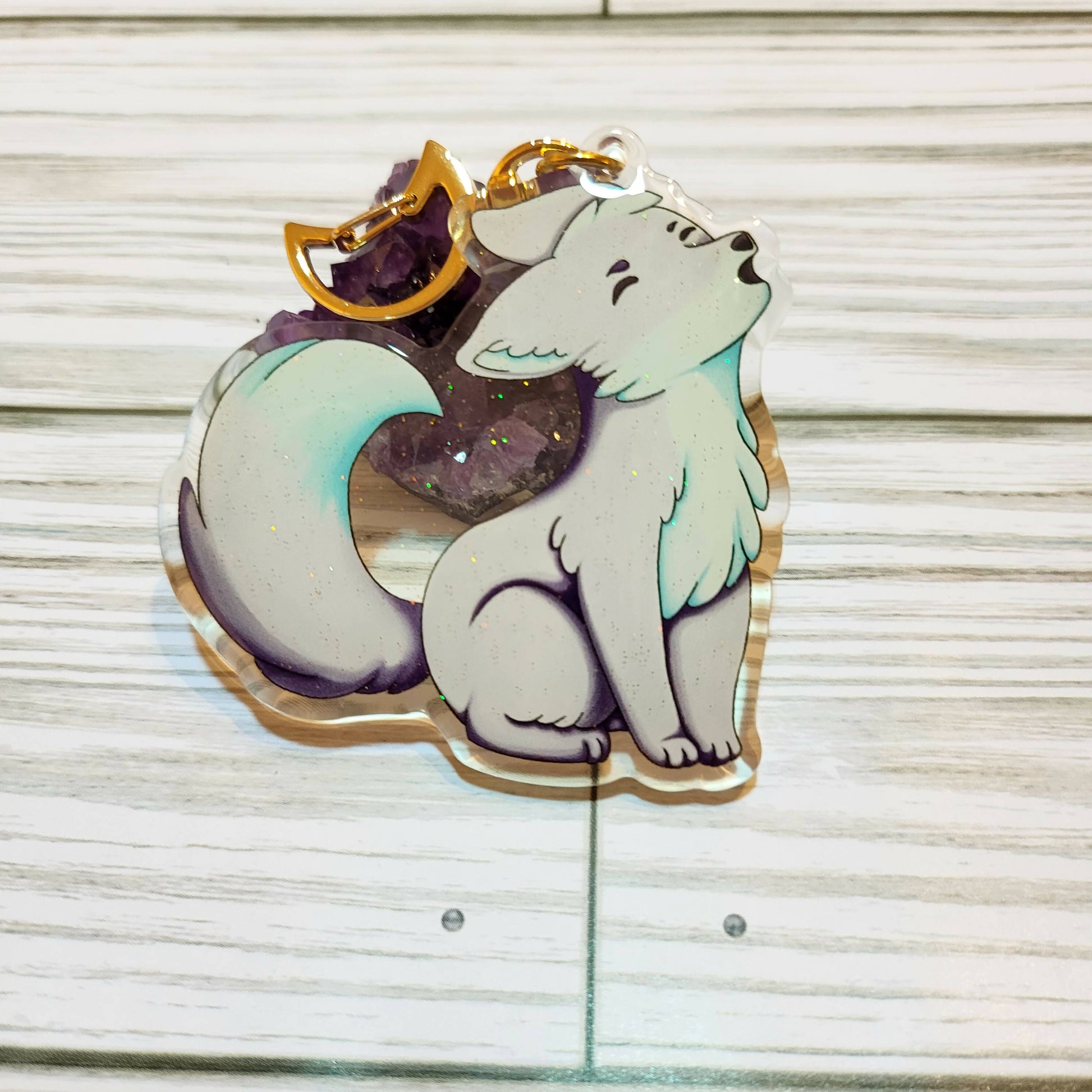 Decorate your favourite carrying case, coat, phone, or whatever you like, with this beautiful and sparkly wolf key chain featuring my original illustrations!