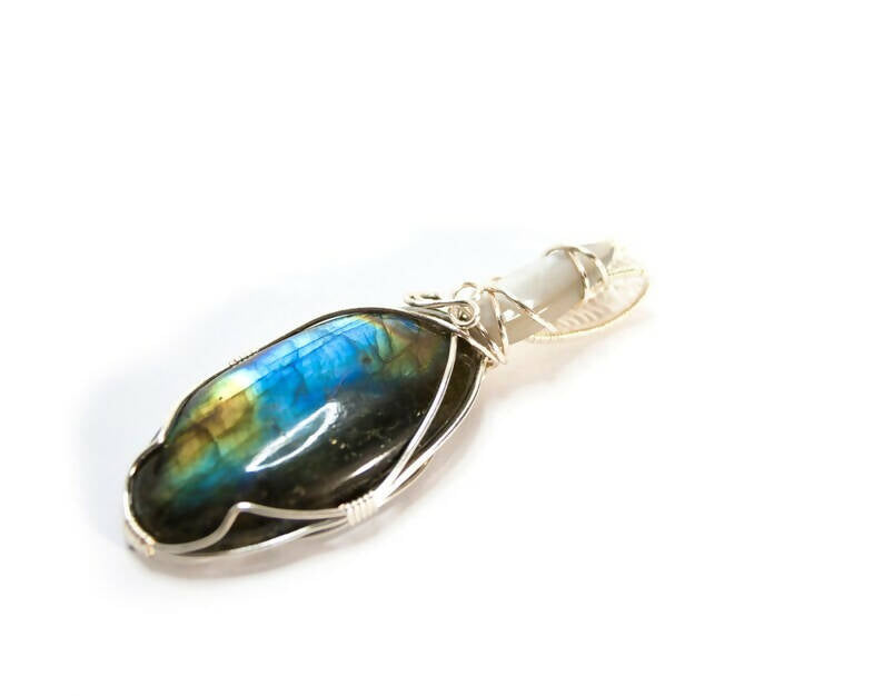 Labradorite, gray moonstone and silver wire wrapped pendant necklace